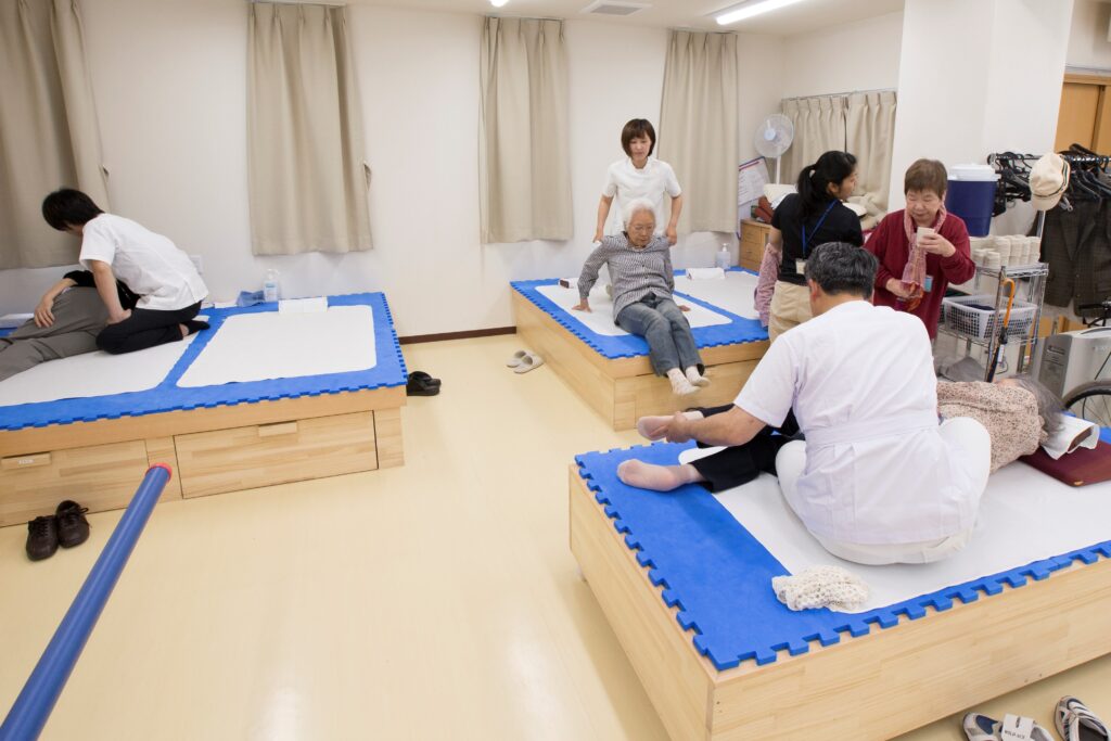 鍼灸あんまマッサージ指圧師や柔道整復師による関節運動や筋力増強運動を中心に行い、歩行訓練などを通して日常生活を送るために必要な自立度の獲得を目指しています。