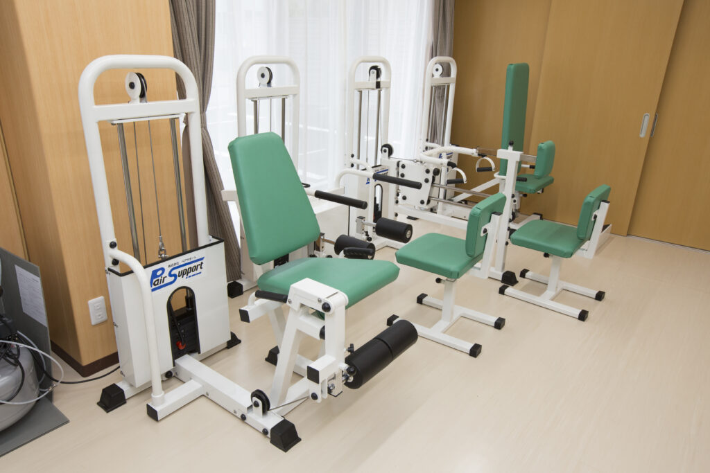 トレーニングマシン、滑車運動、平行棒、ペダル漕ぎ、ストレッチ器具、月面歩行、ルームランナーなど多様な運動器具を設置しています。