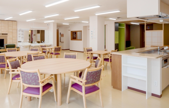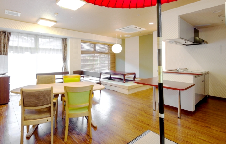 各フロアには食卓スペースの他、ソファースペース、4階浴室付近の「湯あみ処」、1階には「カフェ陽鞠(ひまり)」、カラオケ・映画を楽しめる「交流スペース雅」など入居者様にくつろいでいただけるスペースをご用意しています。